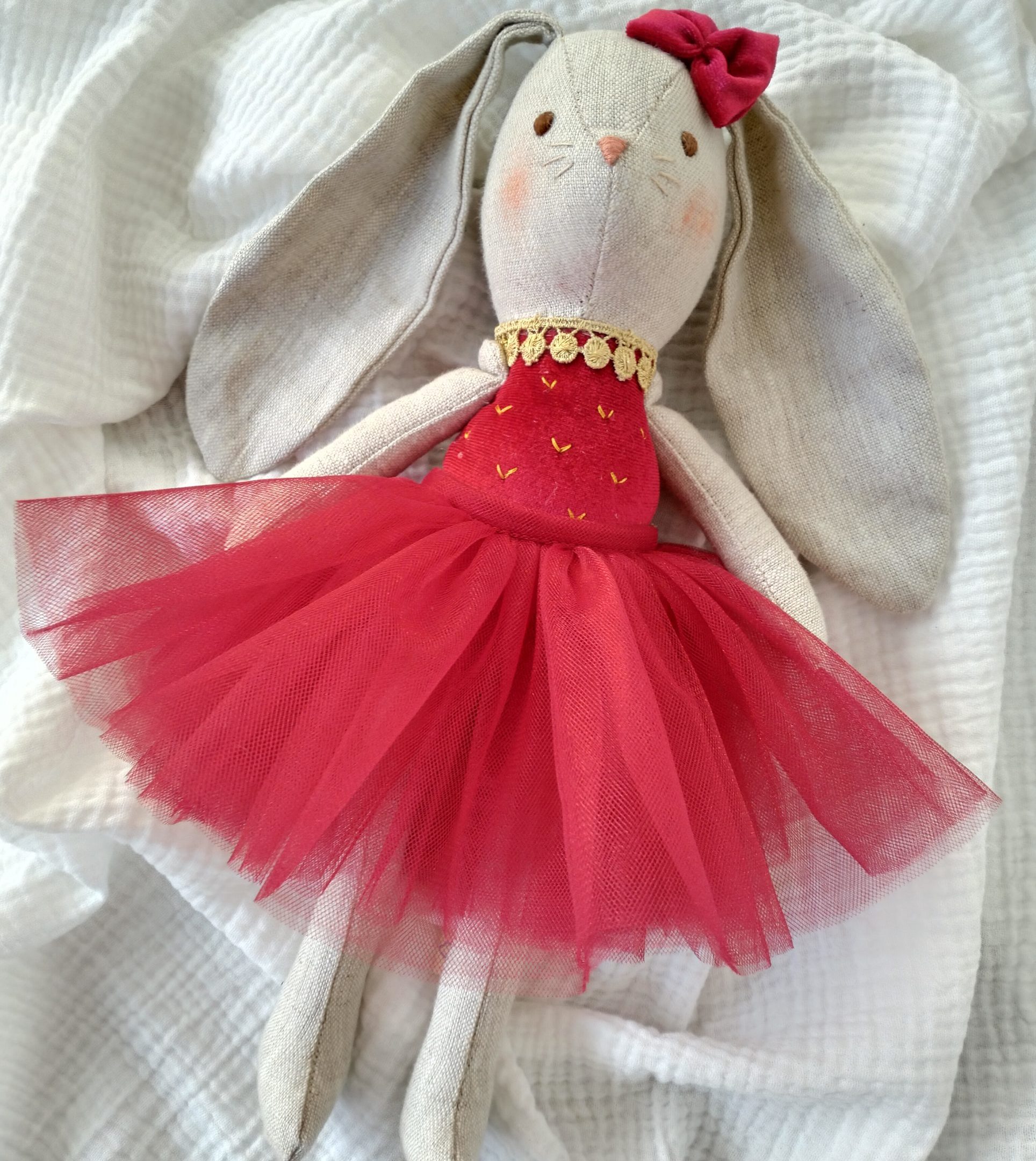 Conejita navideña de lino con térciopelo rojo y tutu.