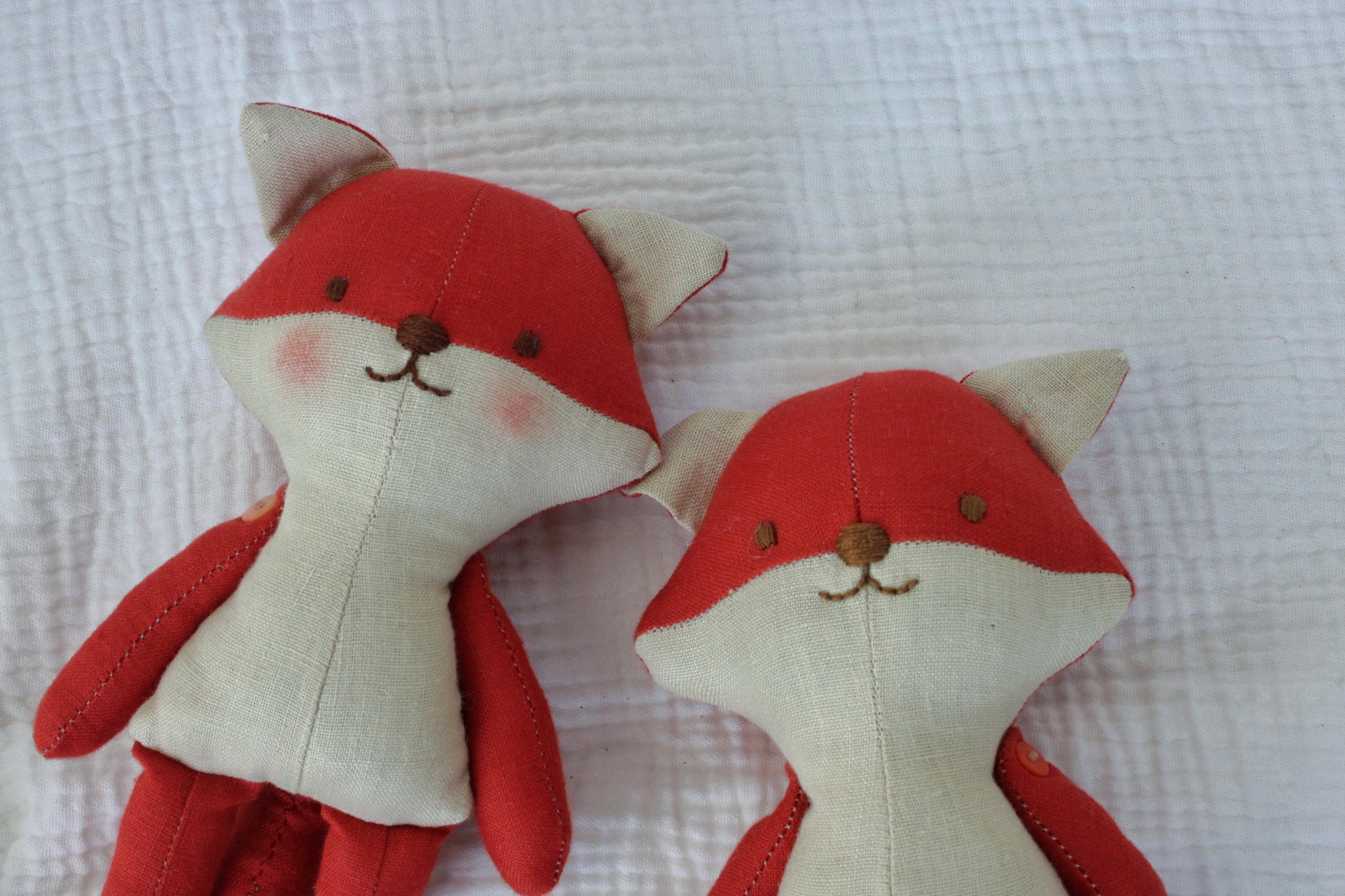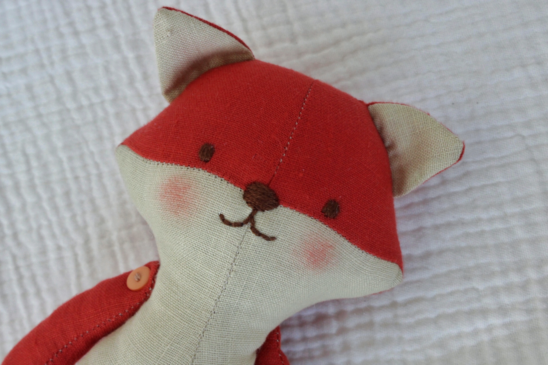 Este muñequito es un zorríto pequeño, para algún amante de los zorros. Esta hecho en lino y bordado a mano. Tiene detalle de botones en los bracitos por lo que , por precaución no es apto para un peque que se meta todo a la boca. ( aunque están muy bien cosidos.)